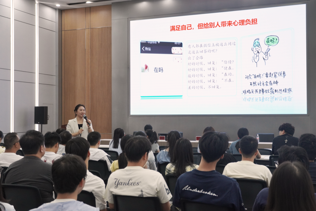 陳瑛老師的講座圍繞自我激勵(lì)、協(xié)同溝通、對(duì)外溝通、對(duì)上溝通四大維度展開。首先,陳瑛老師分別以工作場景和生活場景中的溝通對(duì)話與大家進(jìn)行互動(dòng),帶領(lǐng)大家對(duì)“高情商”進(jìn)行思考與剖析,由此展開當(dāng)天的主題。隨后,結(jié)合豐富的實(shí)戰(zhàn)案例與互動(dòng)環(huán)節(jié),陳瑛老師層層遞進(jìn),深入淺出地講解了如何在日常工作中實(shí)現(xiàn)高效溝通,激發(fā)自我驅(qū)動(dòng)力,提升團(tuán)隊(duì)協(xié)同效能。在長達(dá)2.5小時(shí)的課程中,陳瑛老師還結(jié)合商務(wù)禮儀的要點(diǎn),根據(jù)不同場景對(duì)溝通實(shí)操進(jìn)行了解析。并強(qiáng)調(diào),良好的溝通不僅是技巧,更是一種心態(tài)與習(xí)慣的培養(yǎng),也是實(shí)現(xiàn)個(gè)人與團(tuán)隊(duì)實(shí)現(xiàn)共同成長的重要途徑。